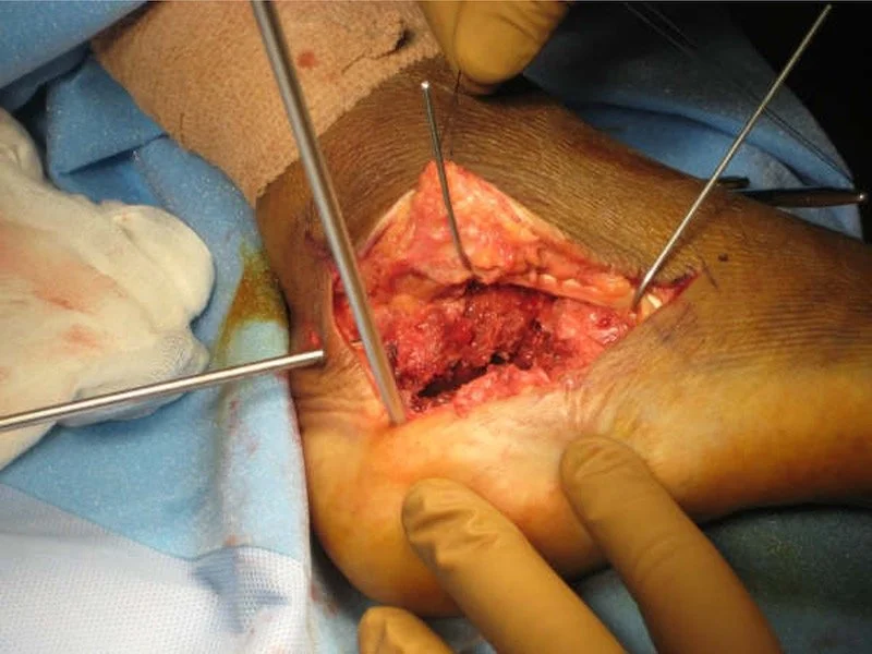 You can see in this picture during surgery that the bone has a black dark area through it , thats how the fracture line looks. When these bones break the bone is crushed into itself and we essentially lose bone shape. During surgery we put it all together as much as possible. Then we apply a large plate that you can see in the next photo tp hold all of the fragments together. As you can see this is a large incision, we prefer not to do it this way so 90 percent of the time we are able to use or minimal incision technique for these bone repairs.