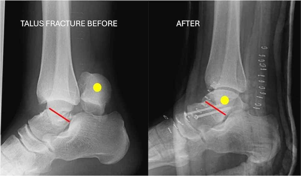 A talus fracture is a break in the bone that makes up the lower part of the ankle joint. Unlike other bones, the talus is 70% covered in articular cartilage and has a limited blood supply. This makes these fractures particularly "high-stakes" injuries that require immediate specialist attention to prevent long-term complications like arthritis or bone death. in the xrays above on the left you see a broken and dislocated talus. The yellow dot shows a bone fragmentclearly not in a correct position. The red line denotes the bone crack ( we call that the fracture line). In the picture on the right you see the bone marked by the same yellow dot back in its normal anatomical position. The red line still shows where the fracture line was. The two screws hold the bone together.